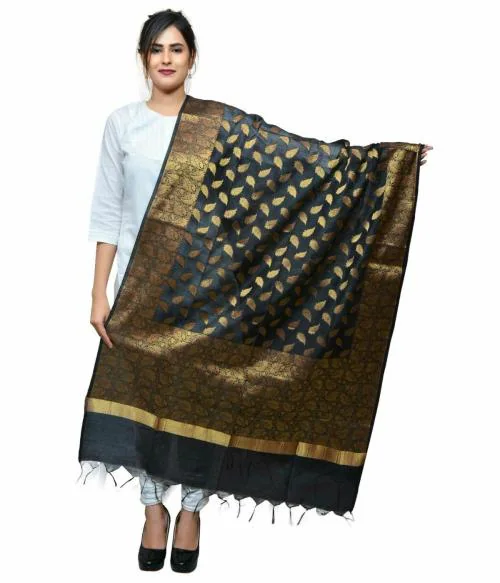 Banjara India Women's Banarasi Kora Silk Zari Dupatta - Leaf-Black