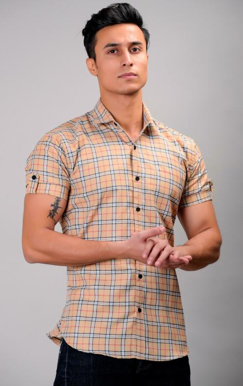 BASE 41 Men Cream Checkered Cotton Blend Casual Shirts