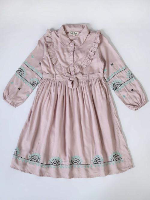 Bella Moda Cotton Embroidery Print Round Neck Fit And Flair Full Sleeve Girl Dress - Off White