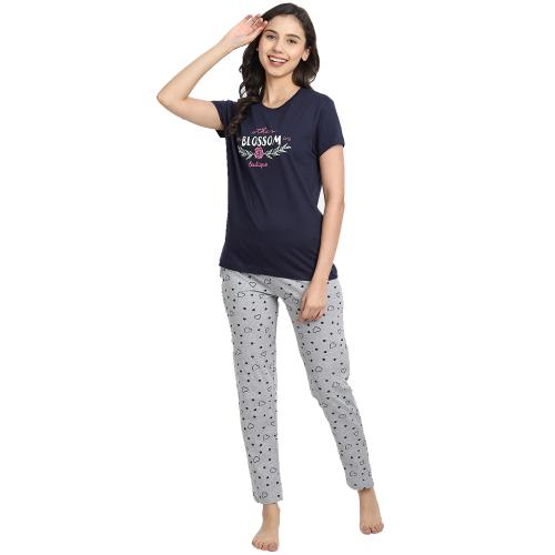 BillyBall Cotton Blue Printed Night Dress/Pyjama Set For Women Pack of 1,Large
