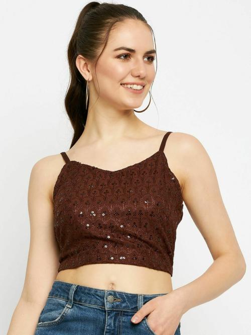 Brinns Brown Embellished Shoulder Straps Crop Top