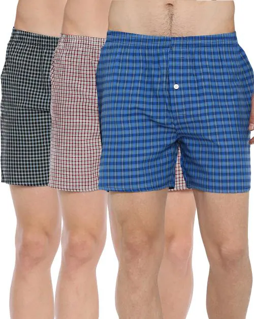 BROON Men's Multicolor Checkered Pure Cotton Pack of 3 Boxer Shorts