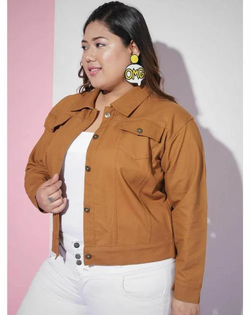 Buynewtrend Curvy Twill Denim Brown Plus Size Women Regular Jacket