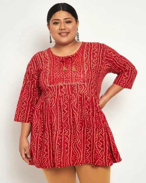 Buynewtrend curvy Women Plus Size Red Bandhani Printed Gotta Patti Flared Short Kurti Top