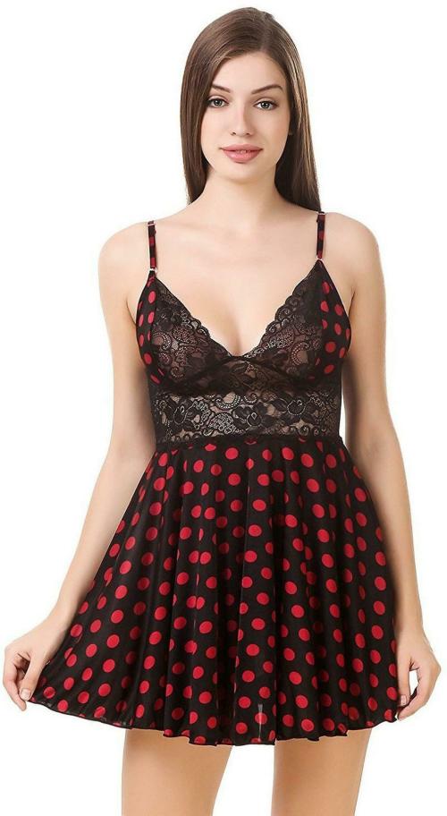 CALENDULA Women Black and Red Polka Print Satin Blend Babydoll l Night dress l Night gown l Nighty for women