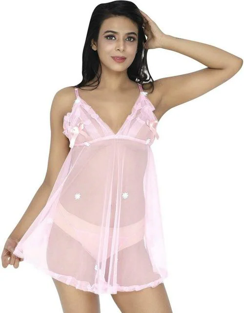 CALENDULA Women Light Pink Self Design Net Babydoll l Night dress l Night gown l Nighty for women