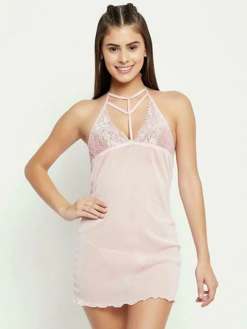 CALENDULA Women Light Pink Self Design Net Babydoll l Night dress l Night gown l Nighty for women
