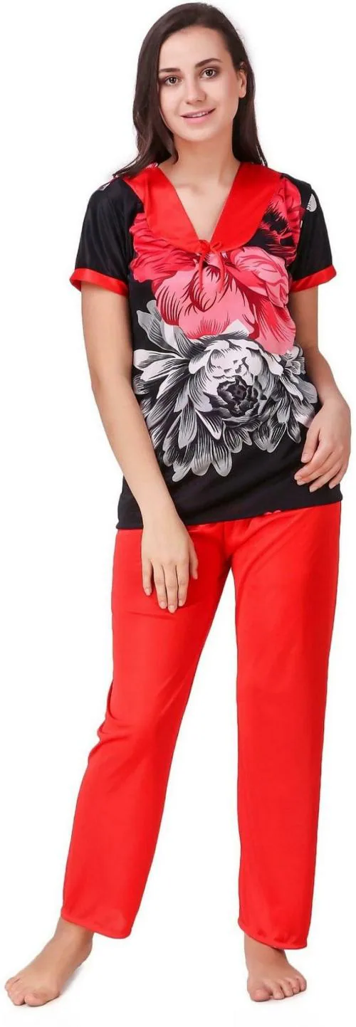 CALENDULA Women Red Floral Print Satin Top and Pyjama Set l Night dress l Night gown l Nighty for women
