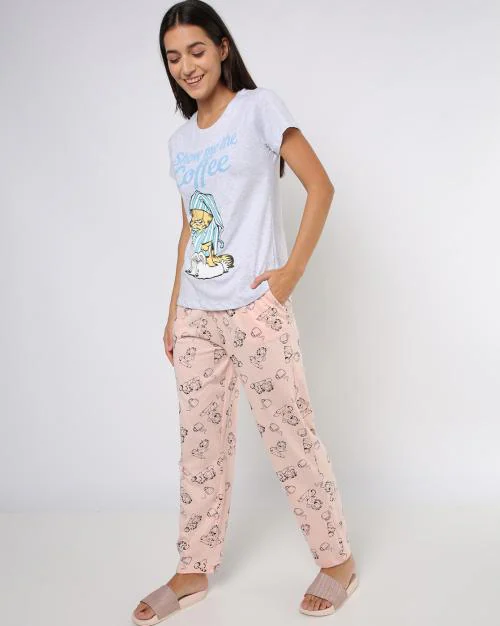 Cartoon Print Round-Neck T-shirt with Pyjamas