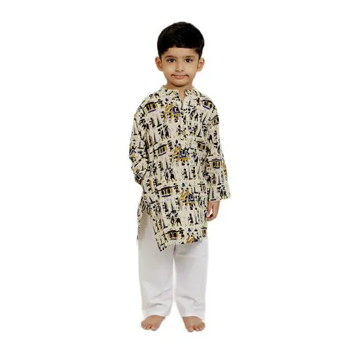 Chheent Beige Baraat Bagru Cotton Traditional Handloom Kurta With White Pyjama Set For Baby Boys (2-3 Years)