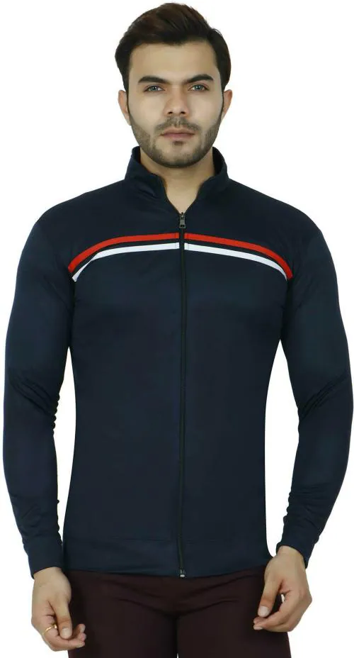 Cloflix Men Navy Blue Striped Polyester Sports Jacket (Xxl)