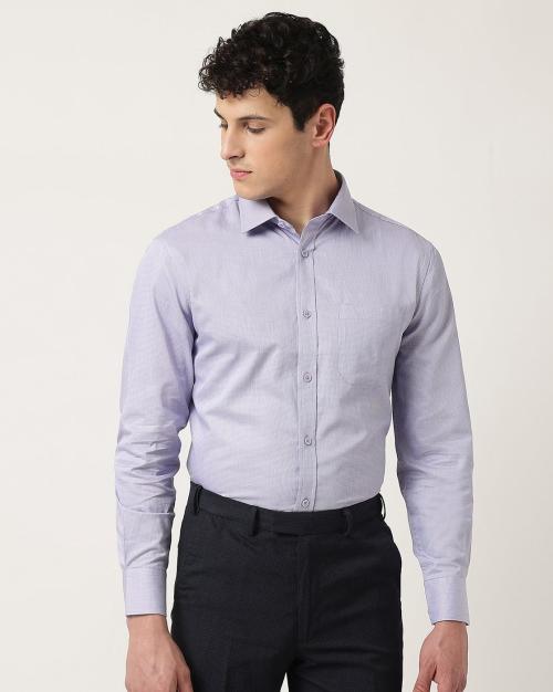 - This purple shirt is a seasonless style and a wardrobe staple for the urbane Indian man. This classic piece has been crafted with pure cotton that gives it a premium finish and a soothing hand-feel. Handcrafted with perfection, the shirt features a regular collar and long sleeves that allow for easy wear. Style it by wearing it exclusively with trousers or layering it with a blazer.