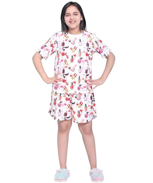 Curly Tales Girls Off White Printed Polyester Blend Top With Shorts (13 Years-14 Years)