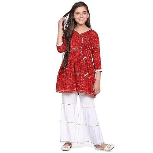 Curly Tales Girls Red Foil Printed Rayon, Poly Rayon Kurta With Sharara (13 Years-14 Years)