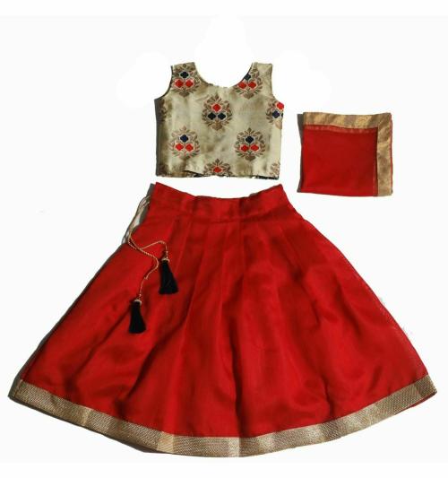 D9Kids Girls Red Solid Cotton Lehenga, Choli and Dupatta Set