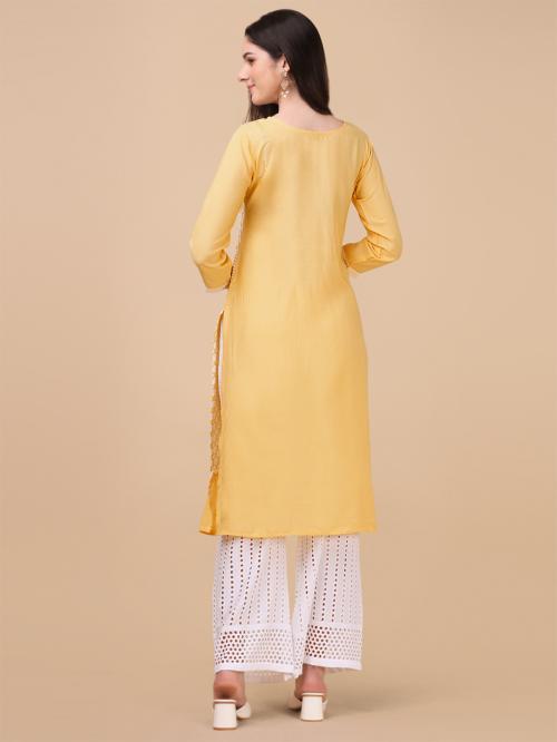 When styling this Lucknowi work kurta with a palazzo set, you can accessorize with delicate silver or pearl jewelry, such as jhumkas (dangling earrings) or a statement necklace. Pair the outfit with embellished or embroidered sandals for a complete traditional look.