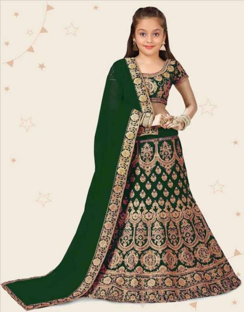 DIZVU Girls Green Embroidered Satin Lehenga, Choli and Dupatta Set 5-6 Y