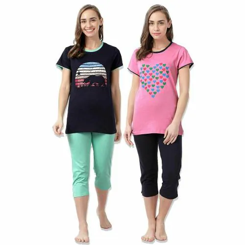 e1k Women Cotton Multicolor Pack Of 2 Top and Pyjamas Set (XL)