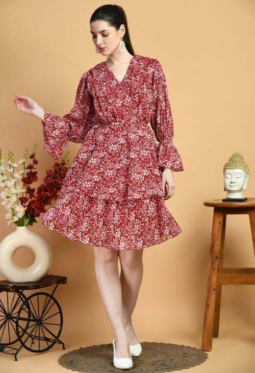 Elanmate Women Georgette Maroon Color Printed V Neck Dress | Women Dress | Dresses for Women