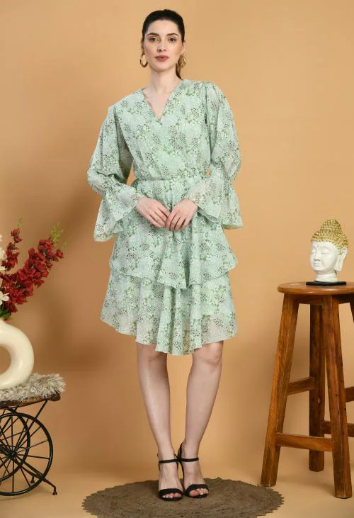 - Comfortable: Our knee length V-neck pleats and layered dress are designed to provide you with ultimate comfort, allowing you to move freely throughout the day.Stylish: Our dresses are fashionable and trendy, featuring unique designs and pattern that are sure to make you stand out from the crowd.Versatile: Our dresses can be worn for a variety of occasions, for a casual day out to a lounge or evening party.High-quality: Our dresses are made from high-quality georgette materials that are durable and long-lasting, ensuring that you get the most out of your purchase.Affordable: Our dresses are priced competitively, making them an affordable choice for women who want to look and feel their best.Easy to care for: Our dresses are easy to care for, requiring minimal maintenance and care to keep them looking great for years to come.