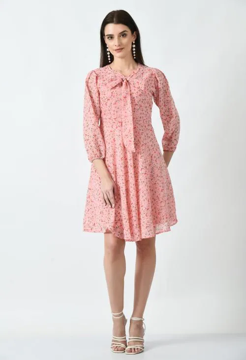 Elanmate Women Polyester Georgette Pink Color Solid & Plain Tie-Up Neck A-Line Middi Dress