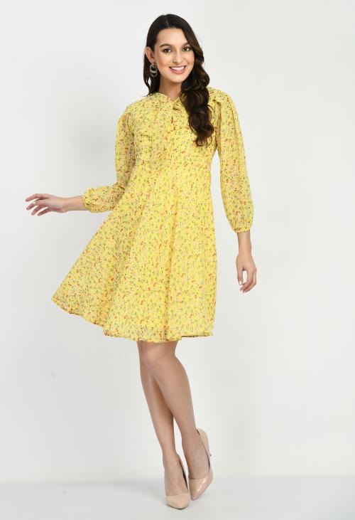 Elanmate Women Polyester Georgette Yellow Color Solid & Plain Tie-Up Neck A-Line Middi Dress