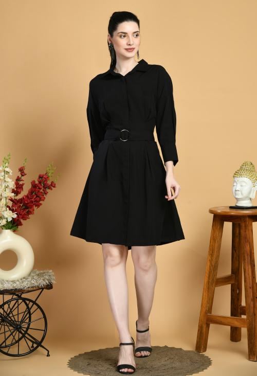 Elanmate Women Polyster Black Color Solid Shirt Coller Dress | Women Dress | Dresses for Women