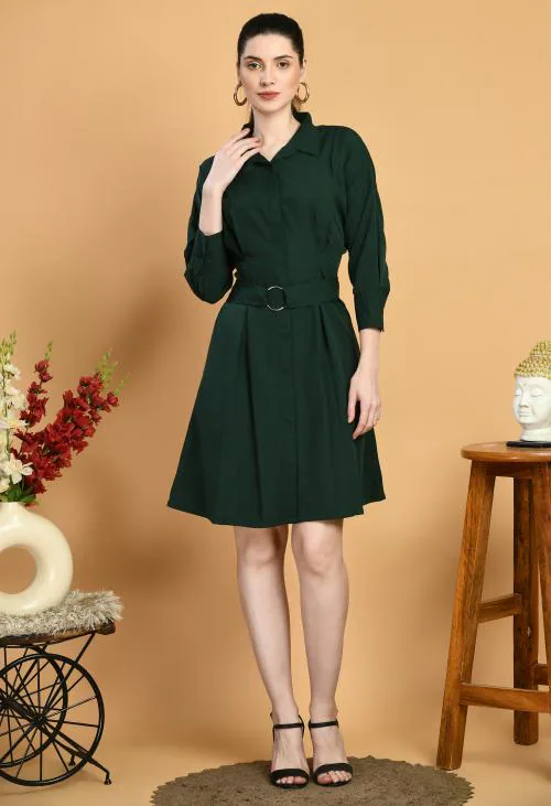 Elanmate Women Polyster Green Color Solid Shirt Coller Dress | Women Dress | Dresses for Women