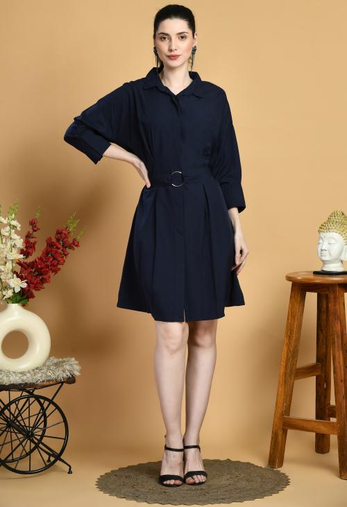Elanmate Women Polyster Navy Blue Color Solid Shirt Coller Dress | Women Dress | Dresses for Women