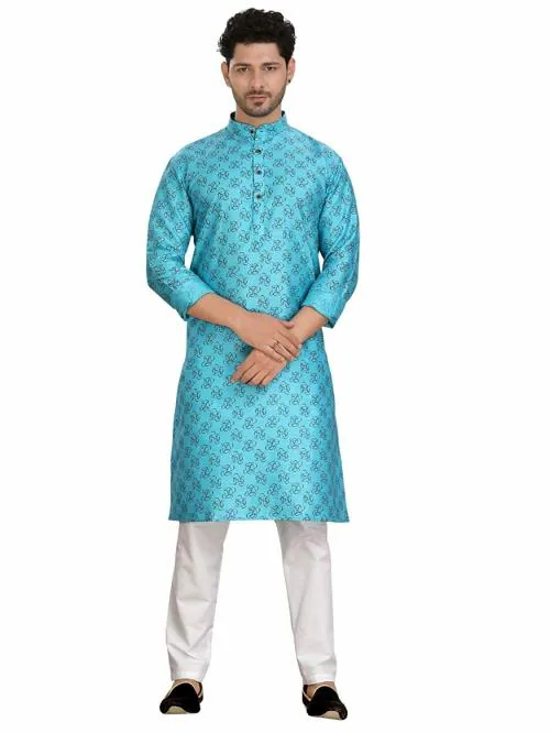 Encino Mens Blue Printed Silk Jashn Collection Kurta Suit