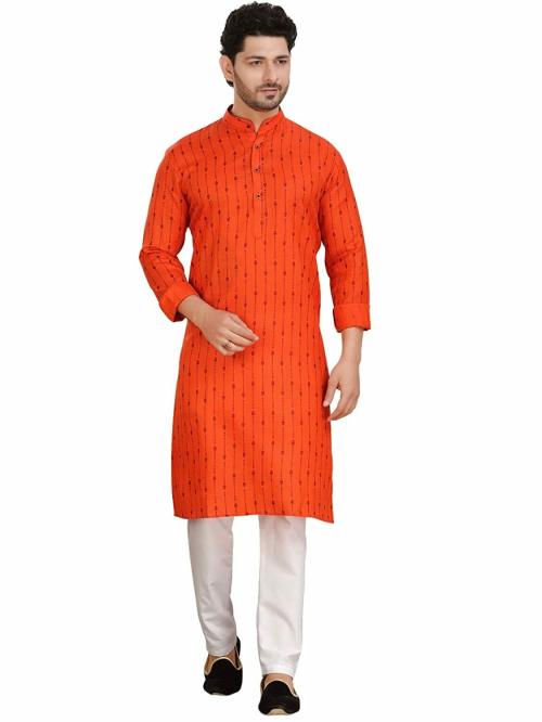 Encino Mens Orange Printed Cotton Angad Collection Kurta Suit