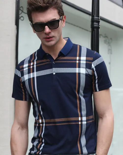 EyeBogler Check Men Polo Neck Regular Fit Half Sleeves Navy Blue T-Shirt