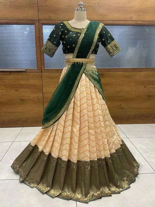 Fabcartz Women Cream, Bottle Green Self Design Jacquard Lehenga Choli