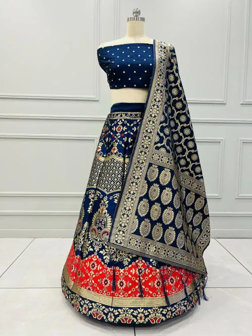 Fabcartz Women Red, Navy Blue Self Design Jacquard Lehenga Choli