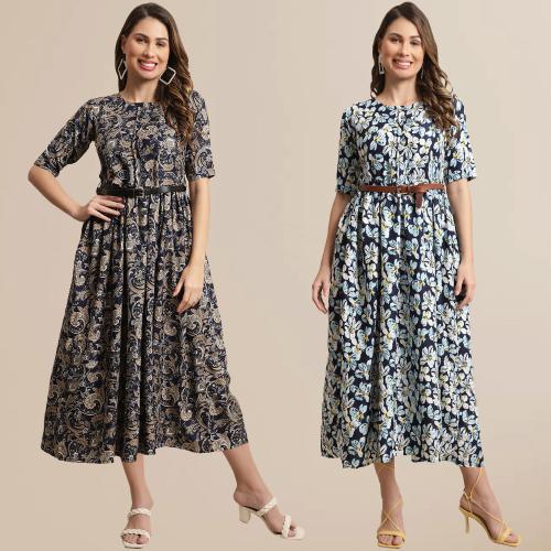 Fabflee Women Pack of 2 Printed Rayon A-line Dress| Dresses| Women Dress| Party Dress| Maxi| Western Dress| Printed Gown| midi dresses| Dress for Women| Maxi Dress for women