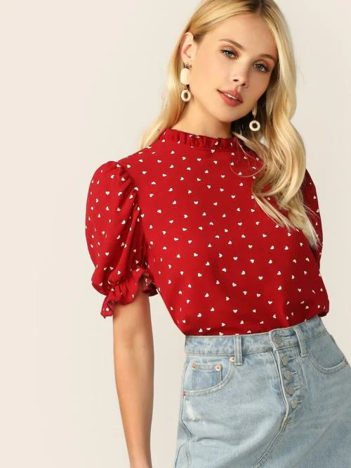 Fabrange Frilled Neck Puff Sleeve Confetti Heart Print Top