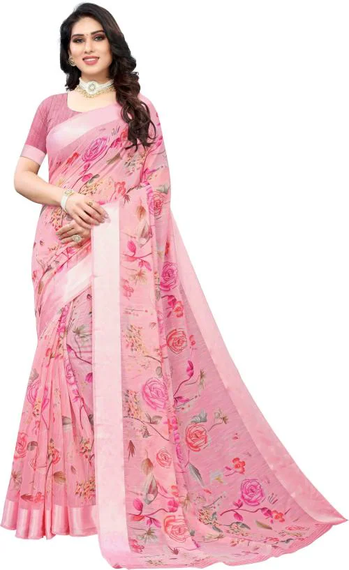 Fabwomen Women Pink Cotton Blend Floral Saree With Blouse Piece