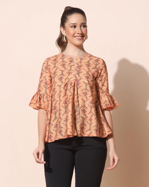 Fashion Dream Women Orange Floral Printed Polyester Top | Women Top| Tops for Women|Women Floral Print Top| Printed Top| Women Casual Top