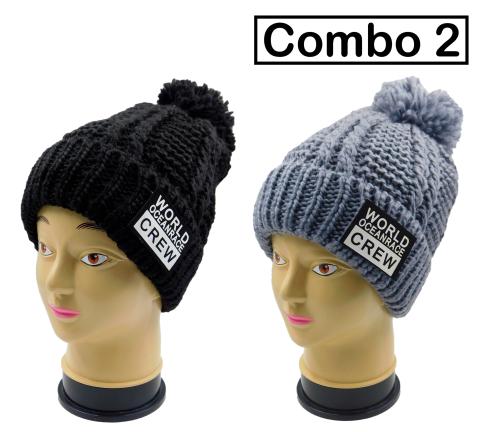 FASHNO Womens Pompom Woolen Winter Cap/Hat Black & Grey Colour Combo of 2/(Pack of 2)