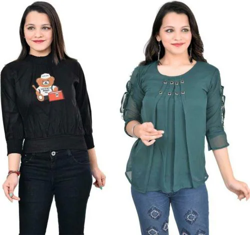 Fikroo Girls Black and Green Graphic Cotton Blend Top10 - 11 Years(Pack of 2)