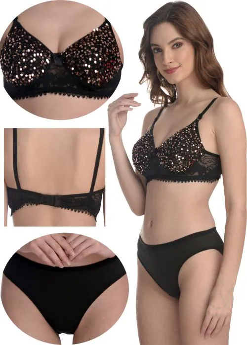 FIMS - Fashion is my style Women Black Self Design Cotton Blend Single Bra & Panty Set