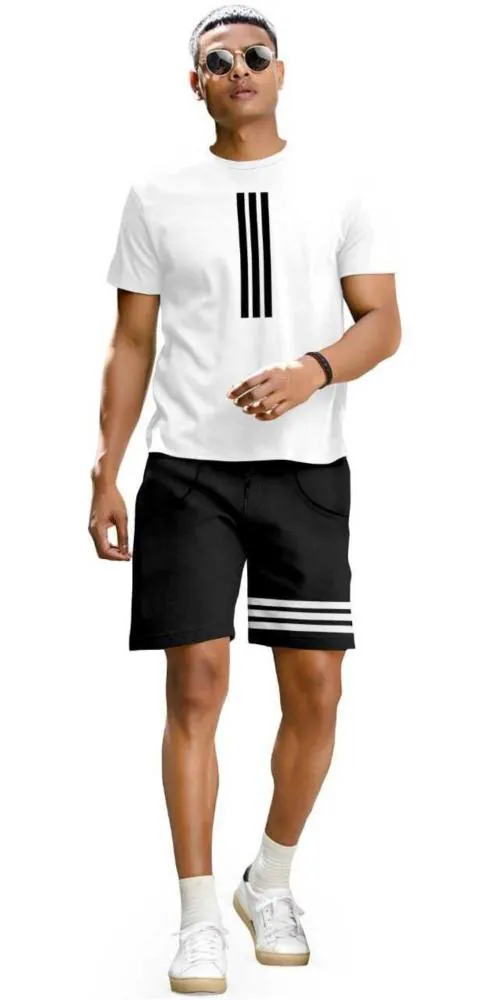 Fionaa Trendz Mens track suit White,Black Striped Cotton Blend Tshirt and Shorts (XXL)