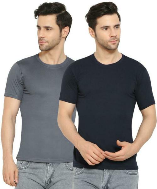 FLEXICA Men Grey, Navy Solid Polyester Pack of 2 T-shirt (XL)