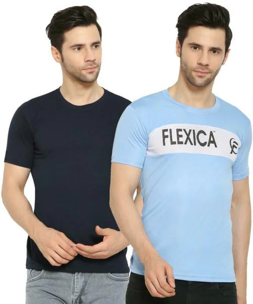 FLEXICA Men Navy, Light Blue Solid Polyester Pack of 2 T-shirt (XL)