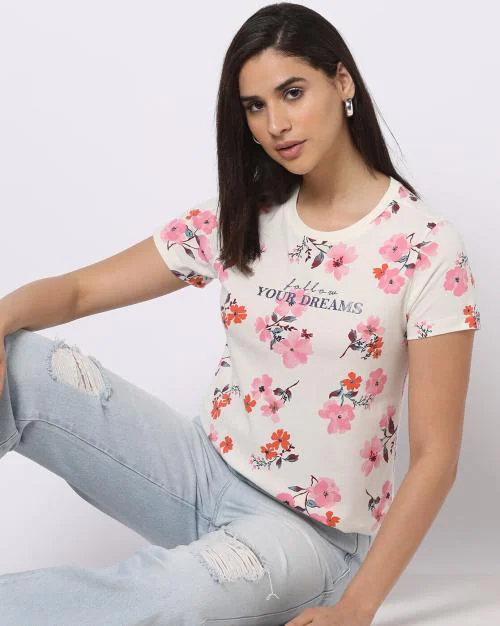 Floral Print Round-Neck Slim Fit T-Shirt