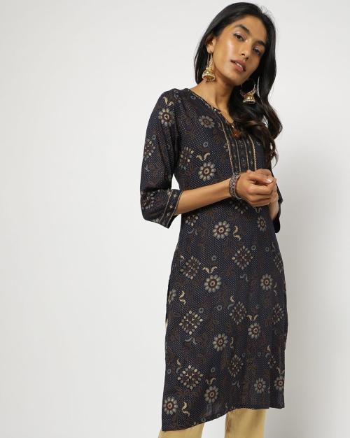 Floral Print V-neck Straight Kurta