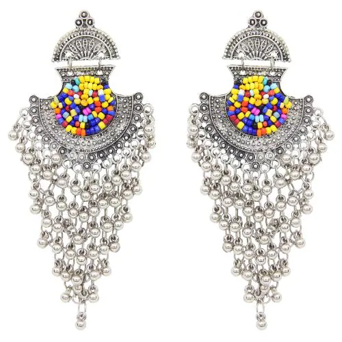 Fresh Vibes Multi-color Beads Black Metal Long Chandbali Earrings for Women with Ghungroo Hangings - Stylish & Fancy Party Use Silver Jhoomar Earings for Girls