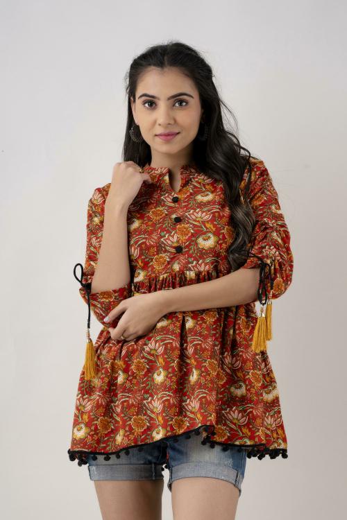 ftDiva Women's Cotton Floral Printed Tunic in Red