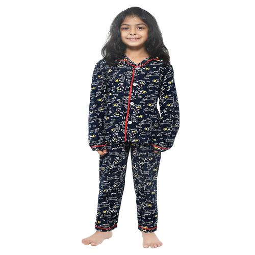 Funkrafts Kids Premium Cotton Full Sleeves Collar Style Printed Nightsuit - Black(5-6 Y)