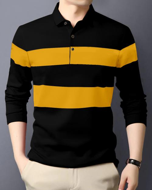 Gespo Black & Mustard Colorblocked Polo Neck Full Sleeve Casual T-Shirt